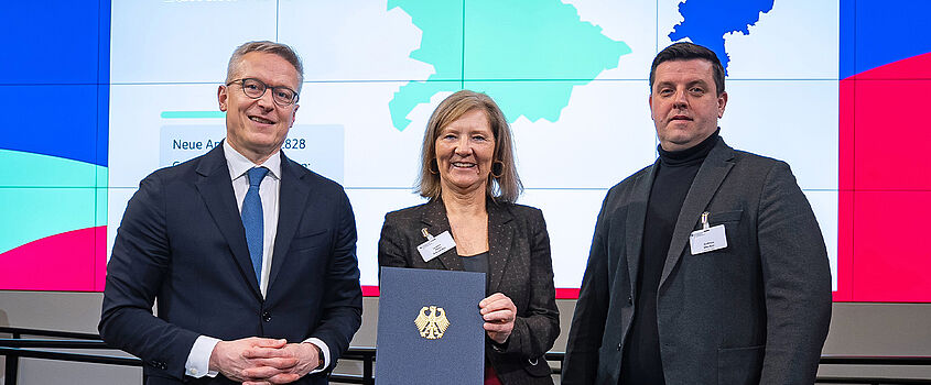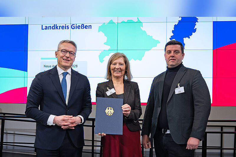 Bundesminister Dr. Karsten Wildberger (l.) überreichte die Förderurkunde an Landrätin Anita Schneider und Andreas Mezker, Breitband-Koordinator des Landkreises Gießen. (Foto: Bundesministerium für Digitalisierung und Staatsmodernisierung)