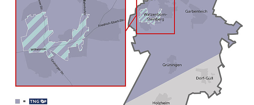 Laut den Ausbauplänen der TNG Stadtnetz wird das Glasfasernetz im gesamten bebauten Bereich von Watzenborn-Steinberg errichtet. Darüber hinaus findet aktuell der Ausbau in Garbenteich und Hausen statt. Anschließend folgt der Ausbau in Grüningen.