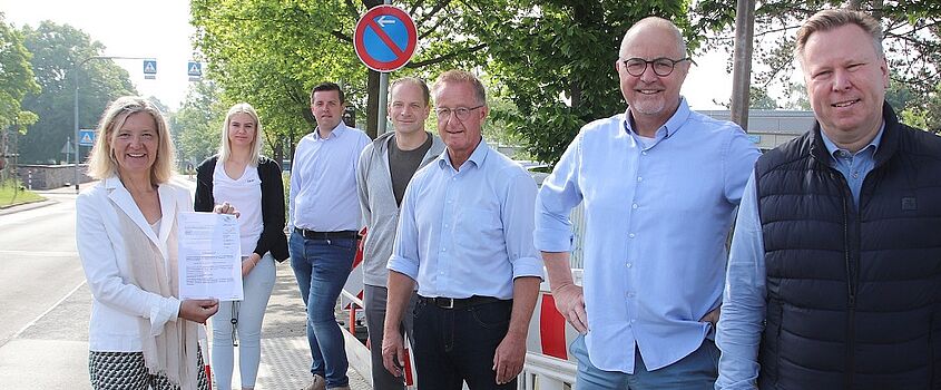 Landrätin Anita Schneider (vorne links) freut sich gemeinsam mit (v.l.n.r.) Melania Kampa, Andreas Mezker, Thomas Schmidt, Dr. Bernd Wieczorek, Peter Blasini und Stefan Becker über den endgültigen Förderbescheid des Bundes für den Breitbandausbau.