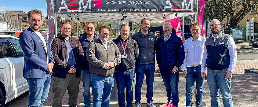 v.l.n.r.: Jerome Steinmetz (Mitarbeiter Breitbandkoordination Landkreis Gießen), Oliver Kawurek und Christian Möller (beide Bauamt Stadt Grünberg), Bürgermeister Marcel Schlosser, M. Trinkert (Telekom Technik), Christian Krauss (Inhaber AEM Gruppe), Oliver Knöll (Vertriebsleiter Telekom), Dominik Freudenberger und Philipp Steuernagel (beide AEM Grünberg)