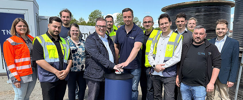 Mit dem Drücken des roten Knopfes haben die TNG Stadtnetz GmbH und die Stadt Pohlheim am Glasfaser-Hauptverteiler in Garbenteich symbolisch die ersten 500 Glasfaseranschlüsse in den Pohlheimer Stadtteilen Garbenteich und Hausen aktiviert. Anwesend waren auch Vertreter der Breitbandkoordinatoren des Landkreises Gießen und der Breitband Gießen GmbH sowie des für den Tiefbau zuständigen Unternehmens TBG GmbH aus Darmstadt.